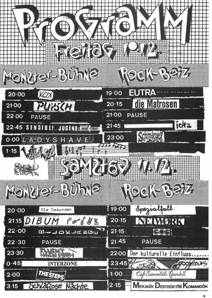 10./ 11. Dezember «Monster Züri-Berlin 1982» mit Interzone, Die Unbekannten, MDK, Flucht Nach Vorn - K.O.K., Putsch, Wet’n’Wild, Dibum, Café Eierwäldli Quintett, Sensible Jugend, Ladyshave, Die Matrosen, Steps und vielen weiteren - Volkshaus, Zürich