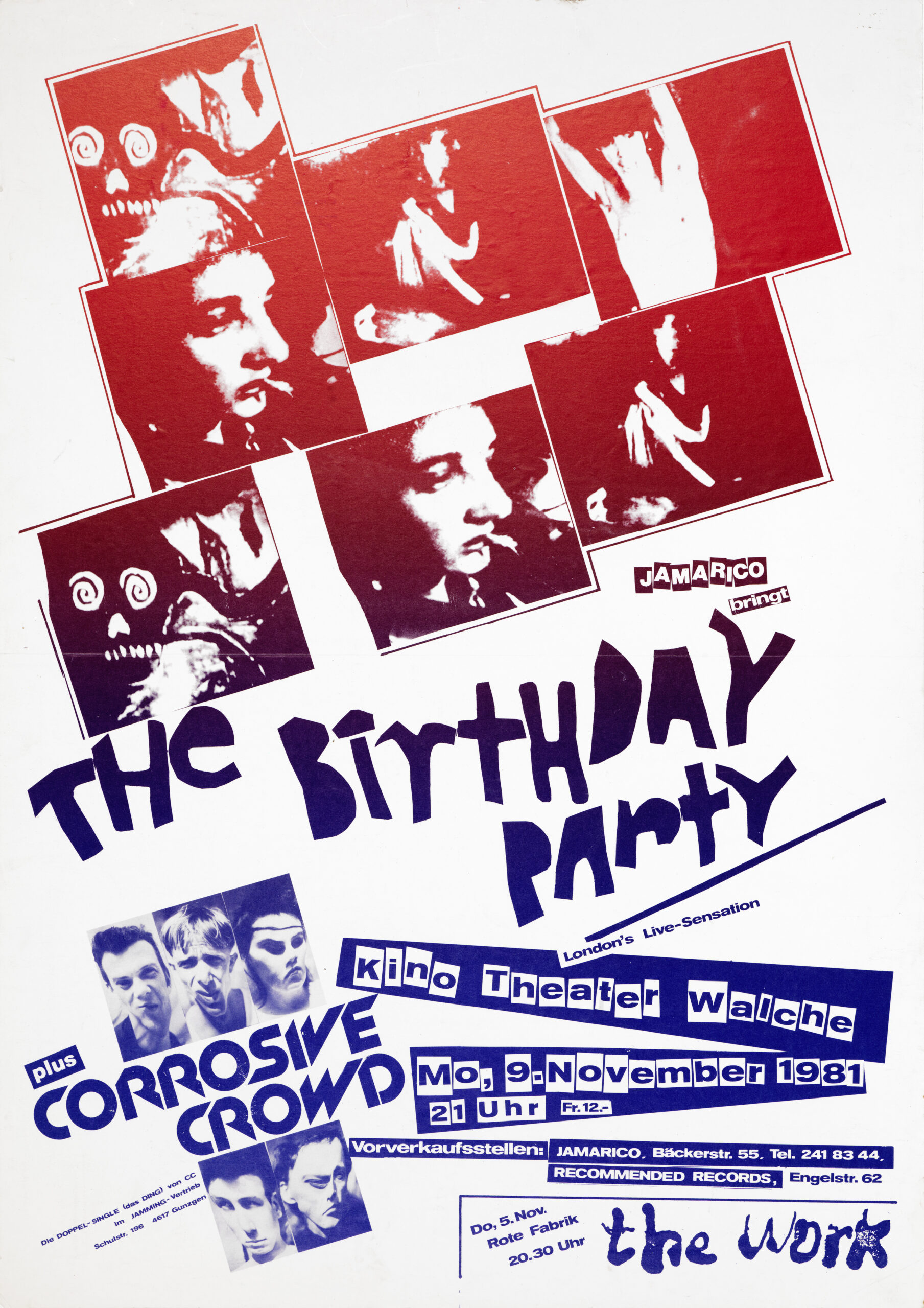 Am Montag, den 9. November 1981 spielen sie als Vorband von BIRTHDAY PARTY im Kino Theater Walche in Zürich. Das Konzert wurde vom Klamotten – und Schallplattenladen Jamarico organisiert und der Schreiber dieses Textes wurde von den drei Inhabern angefragt den Anlass durch das Anbringen von Plakaten zu promoten, was aber zu nichts führte. Pepino vom Jamarico kann sich erinnern;